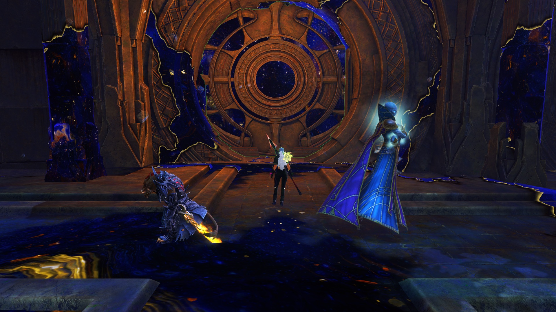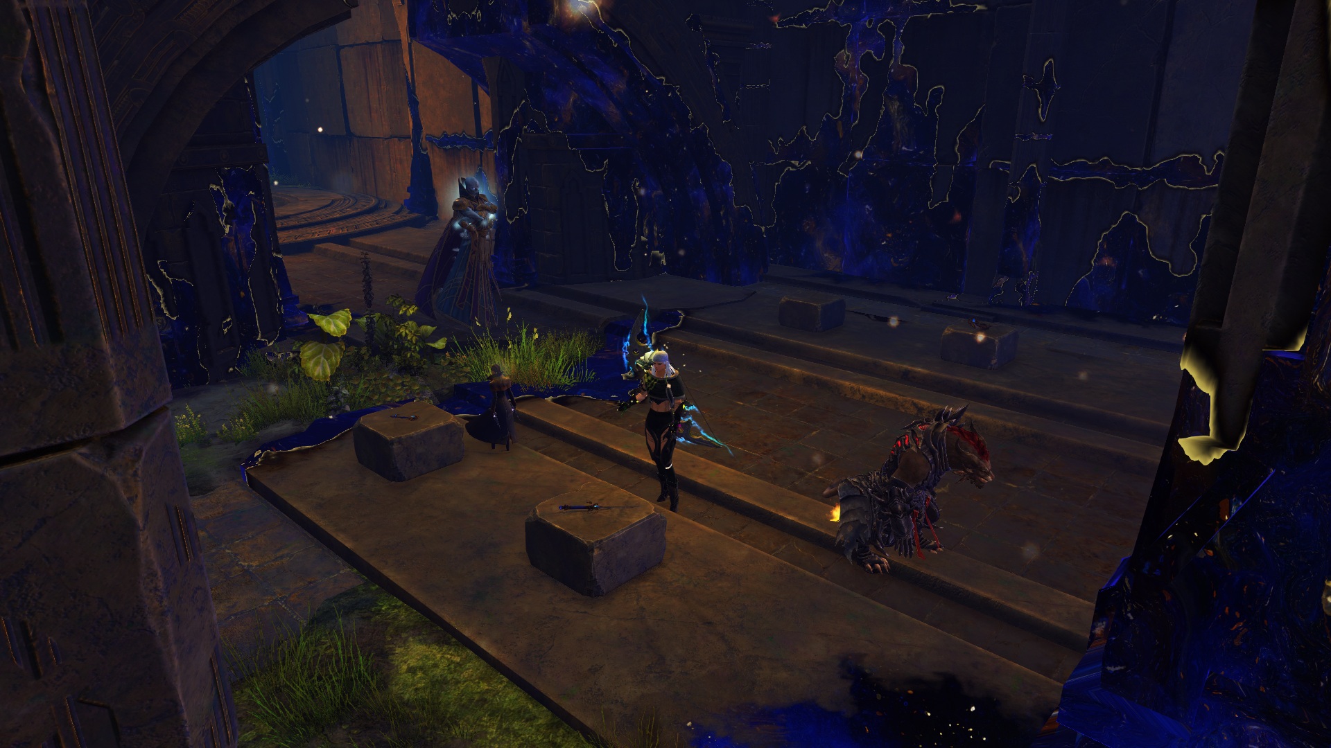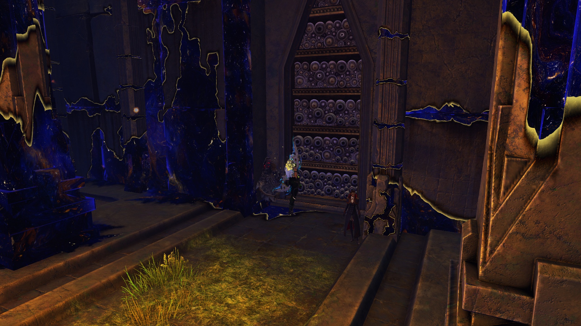 Isgarren: Allerdings. Meine Leute waren ebenso theatralisch wie pragmatisch. Die Tür scheint mit einem mehrstufigen Zauber versiegelt zu sein. Um sie zu öffnen, müssen wir jede Stufe manuell aktivieren, damit das Schloss aufspringt. Die Aktivierungspunkte dürften hier irgendwo in der Nähe sein...Aber da es unter uns keinen Gewölbewächter gibt, müsst ihr sie aktivieren, Wegfinderin. Wenn ich es versuche, passiert vermutlich etwas schlimmes.