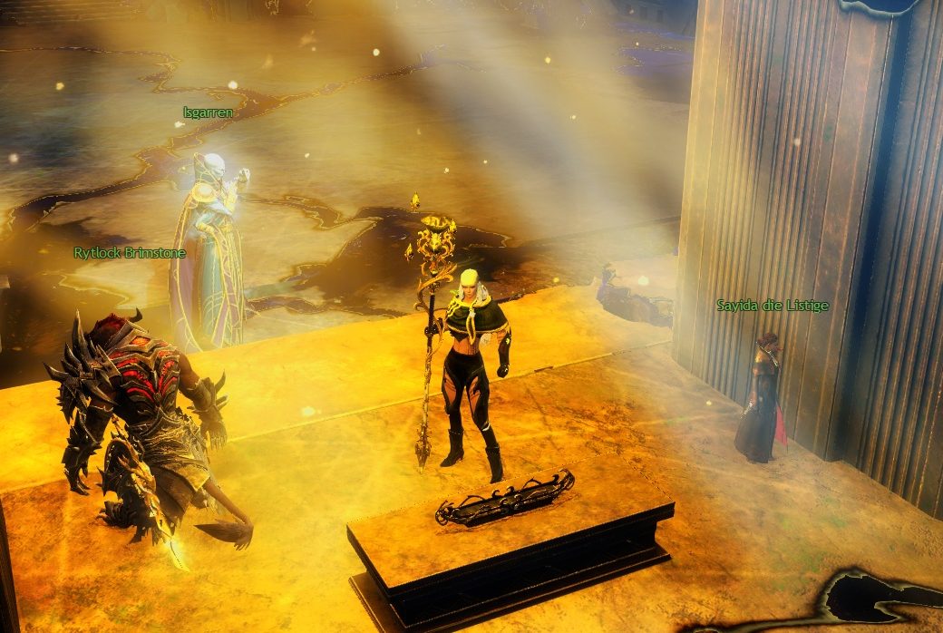 Isgarren: Rührt ihn nicht an, Wegfinderin. Es sei denn, ihr wollt, dass all Eure Körperflüssigkeiten mit einem Schlag verdampfen.