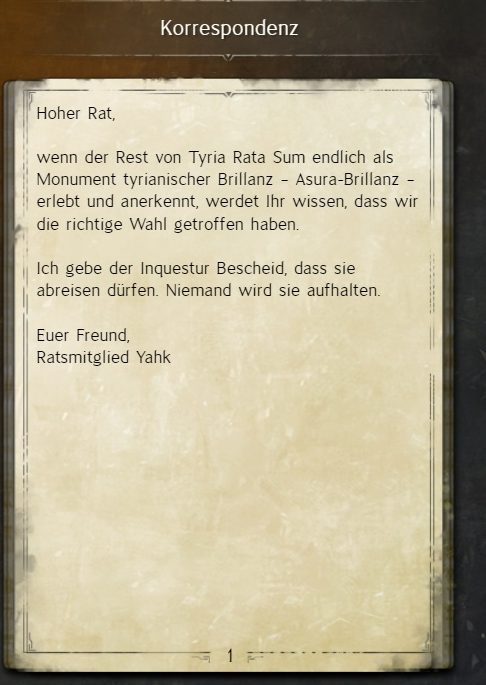 [Vloxx]: Ja, es ist noch Zeit. Genau deshalb muss ich weitermachen. Es geht um die Zukunft unserer Welt. Dank Euch hat Tyria schon Dutzende Krisen überstanden. Wenn wir jetzt nicht handeln, überleben wir die nächste vielleicht nicht. Ich bin immer noch nicht Euer Feind. Das werdet ihr wohl hoffentlich bald merken. Aber jetzt muss ich dessen ungeachtet erst einmal meinen Weg fortsetzen.