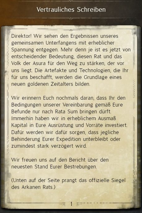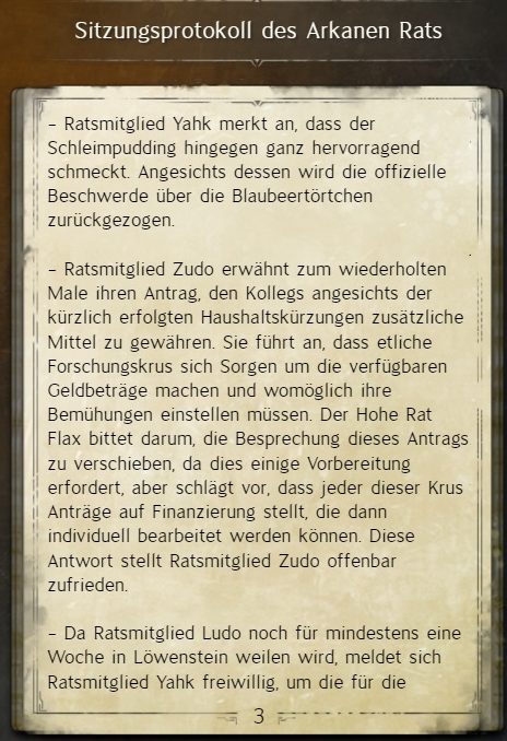 [Ludo]: Inquestur? Schiffe kaufen- Diese alten verschrumpelten, dilettantischen(stöhnt). Das Haushaltskomitee war immer schon geizig, aber in letzter Zeit haben sie den Geldhahn noch weiter zugedreht. Als erstes haben sie den Kollegs die Mittel gekürzt. Dann gab es weitere kleine Einschnitte hier und da. Es würde mich nicht überraschen, wenn da jemand, der Inquestur Gelder zuschustert. Alchemie. Ich habe mir ein paar Gedanken gemacht. Kommt doch bitte zu mir nach Rata Sum. Als Mitglied des Arkanen Rats sollte ich mir nicht die Hände schmutzig machen. Für Euch gilt das aber nicht.
