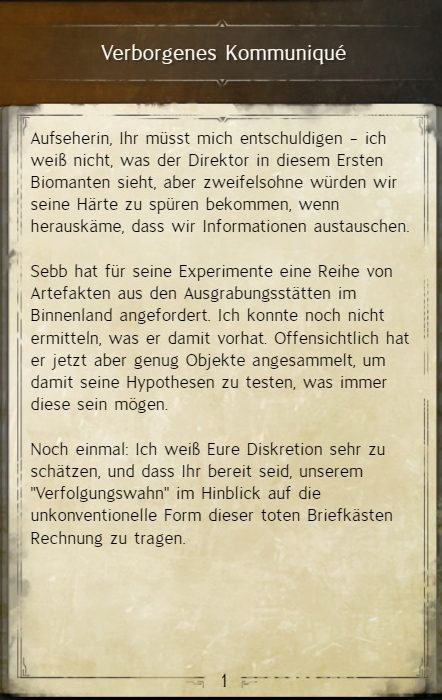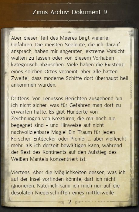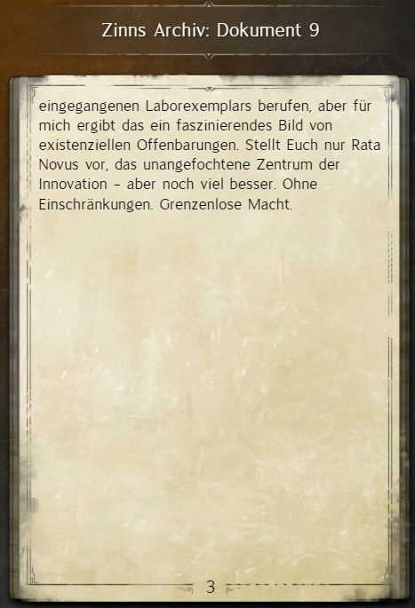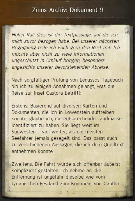 Char: Flax ist in die Sache eingeweiht. Er hat sich mit der Leitung der Inquestur abgesprochen, um Daten aus Zinns Speicher zu entwenden. Sie wollen zu einer Insel namens Castora. Dort suchen sie etwas, aber sie waren so schlau, es nicht schriftlich niederzulegen.