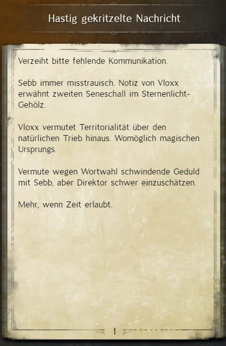 [Vloxx]: Bevor ich weiterrede, muss ich Euch danken, dass ihr Sebb für mich losgeworden seid. Zum Schluss hat seine Grausamkeit seine Nützlichkeit weit überstiegen. Es tut mir leid, dass es sich so entwickelt hat, Kommandeur. Ihr habt was besseres verdient, aber die umstände ließen mir keine Wahl.